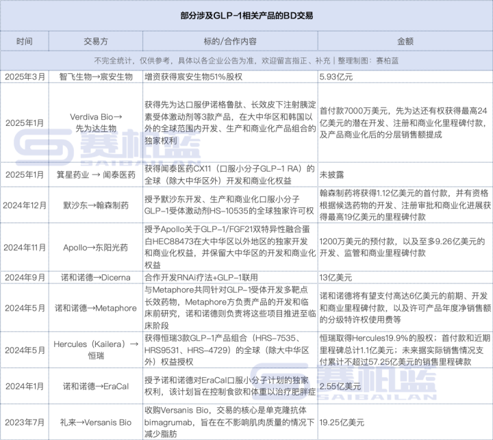 除了自研、仿制入局,GLP-1的高增长预期也驱动着药企通过BD交易抢占先机,多家国内药企以此“出海”。